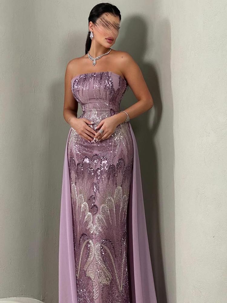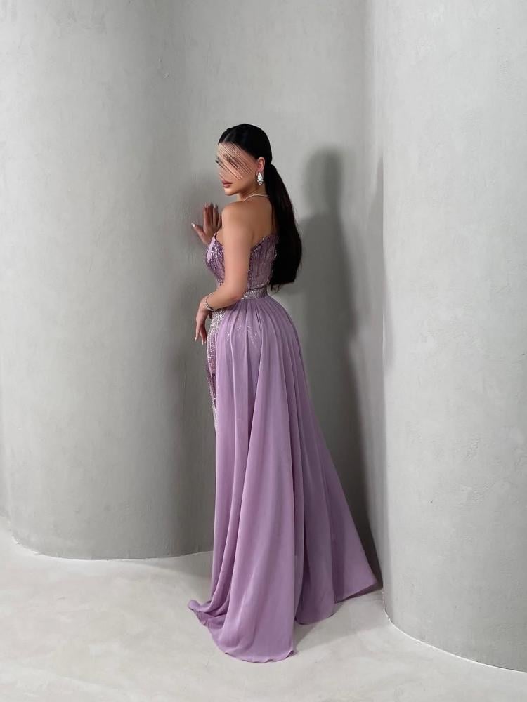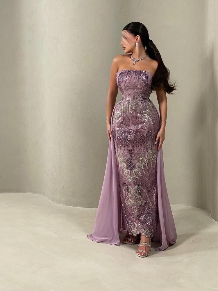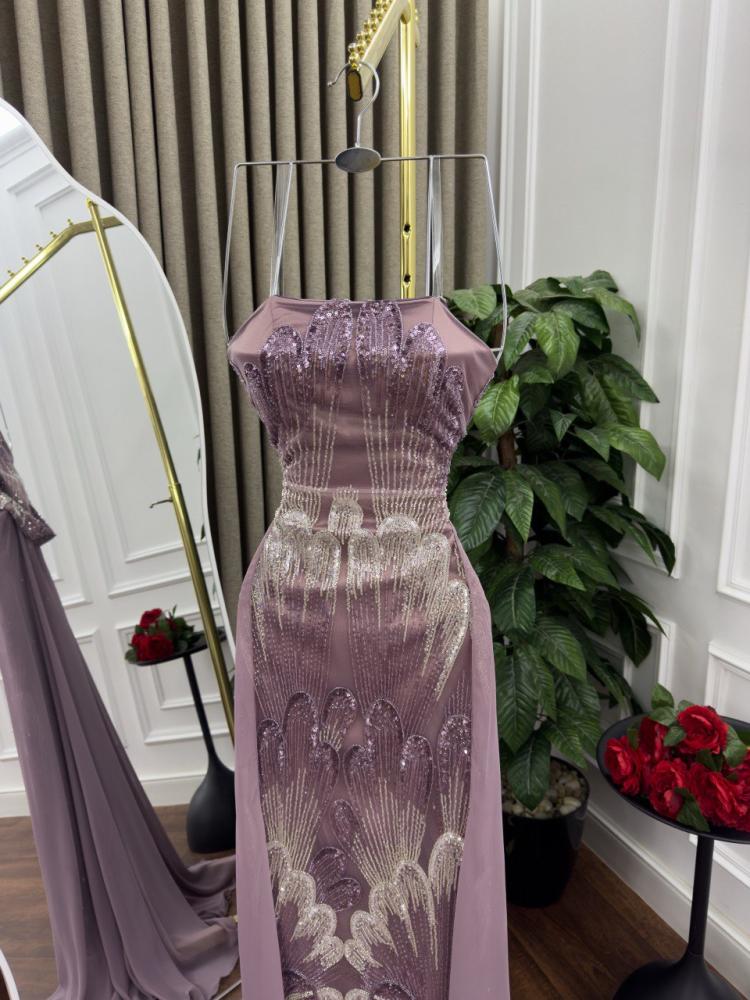 اطلبي الآن فستان سهره بتصميم انيق لاطلالة جذابة تل مطرز بخرز + ذيل شيفون