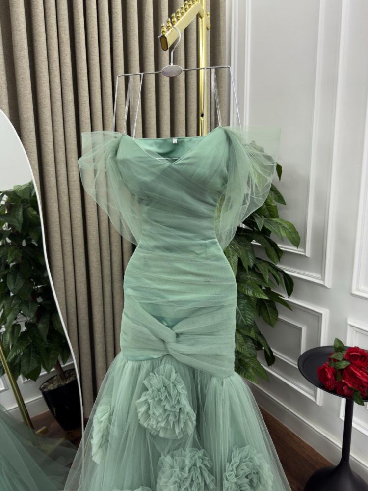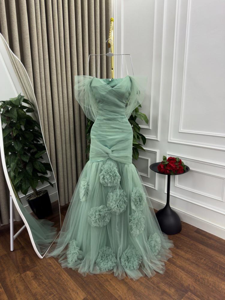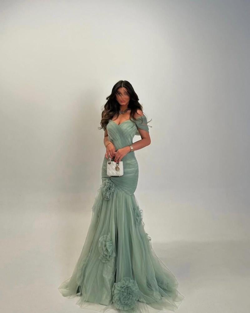 اطلبي الآن فستان سهره انيق بخامة التل والورد البارز+ تصميم اوف شولدر